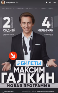 На этот раз телеведущий выложил в сториз афишу. Из нее следует, что артист едет с концертами в Австралию. Выступления состоятся в самом начале учебного года — 2 сентября в Сиднее и 4 сентября в Мельбурне.